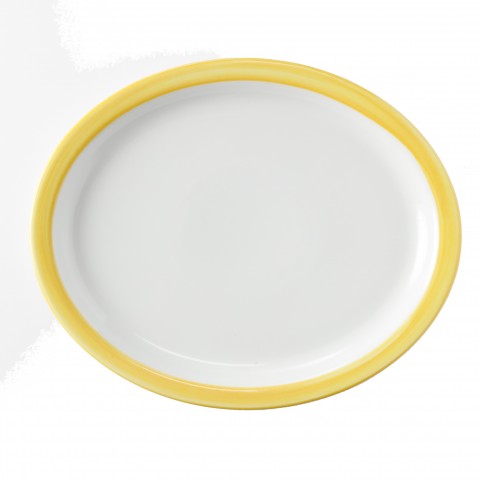 Platter, 13" x 11", oval, narrow rim, rolled edge, scratch/chip resistant, microwave, dishwasher & oven safe up to 380°F, porcelain, orange edge, Corona, Calypso, Yellow (Stocked Item)