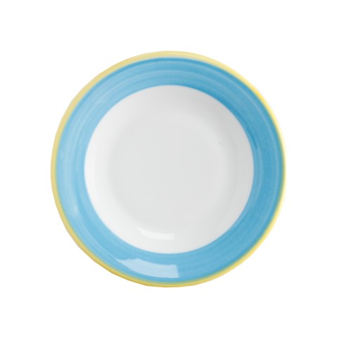 Plate, 6-1/2" dia., rolled edge, scratch/chip resistant, microwave, dishwasher & oven safe up to 380°F, porcelain, yellow edge, Corona, Calypso, Blue (Stocked Item)