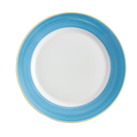 Plate, 9" dia., round, rolled edge, scratch/chip resistant, microwave, dishwasher & oven safe up to 380°F, porcelain, yellow edge, Corona, Calypso, Blue (Stocked Item)