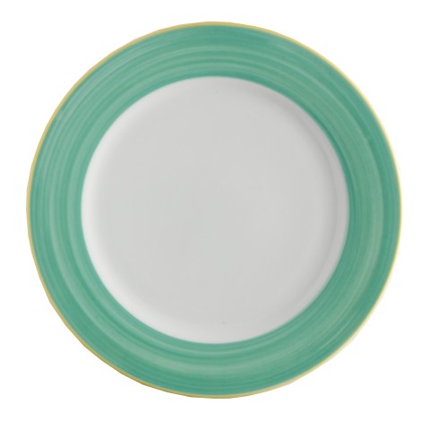 Plate, 12-1/4" dia., round, rolled edge, scratch/chip resistant, microwave, dishwasher & oven safe up to 380°F, porcelain, yellow edge, Corona, Calypso, Green (Stocked Item)