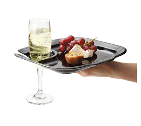 Let's Party™ Party Plate, 9-3/4" x 9", slot to hold drink, fits all G.E.T. stemware and Specktrum™ rocks tumblers, TM-1308, break-resistant, dishwasher safe, melamine, black, NSF (to be discontinued, contact factory for availability)