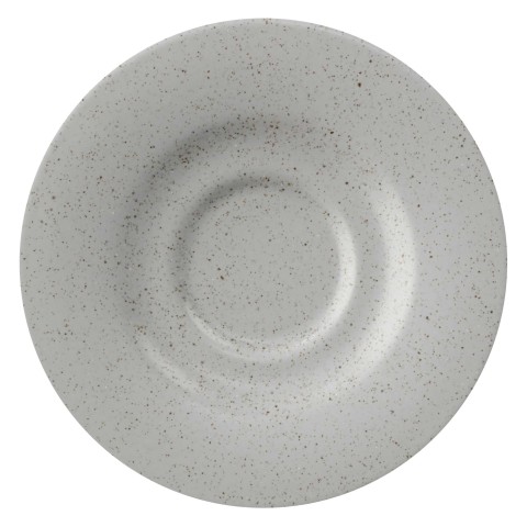 Tea/Bouillon Saucer, 6-1/2" dia., rolled edge, scratch/chip resistant, microwave, dishwasher & oven safe up to 380°F, porcelain, Corona, Cosmos Moon, speckled grey reactive glaze (Stocked item)