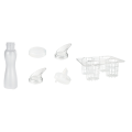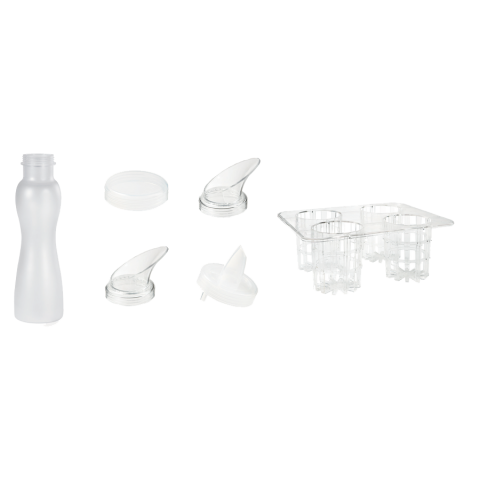 Salad Dressing/Juice Bottles Set, 25 piece, with (1) each rack and (4) each: 32 oz. bottles, storage lids, large pour lids, small pour lids, juice pour lids, blank clips, polycarbonate, dishwasher safe, frosted