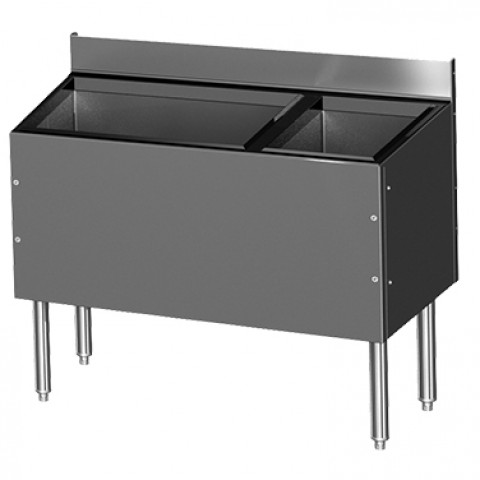CHOICE Extra Deep Underbar Combo Ice Bin/Cocktail Unit, with bottle well storage, 48"W x 19"D, built-in 10-circuit cold plate, 92-lbs. ice capacity, 6-bottle insulated storage compartment each side (12) total, 14-1/2" deep bin liner, backsplash with open channel for beverage lines, PVC plastic breaker strip around ice bin liner, stainless steel construction, adjustable thermoplastic bullet feet, ETL-Sanitation (NOTE: Made to order, not returnable)