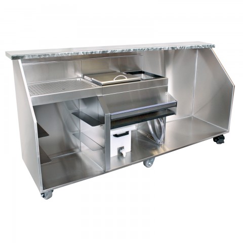 Portable Bar, for glassware with space for refrigerator, 96"W x 28"D x 46-7/8"H O.A., includes: 96"W x 12"D stainless steel bar top with feathered jewel finish, (1) 12"W insulated ice bin with sliding cover & drain, rear condiment area with hinged cover & (3) cups, (1) 18"W iced beverage compartment with drain, glass storage work surface with perforated insert, (3) rack slides for 20" x 20" glass racks, built-in speed rail with PVC sound deadening, storage shelf, built-in 36"W space for refrigerator (refrigerator not included), 6-gallon plastic drain tank with hose & on-off valves, stainless steel construction, (6) 4" rubberized casters (2 locking), ETL-Sanitation (NOTE: Made to order, not returnable)