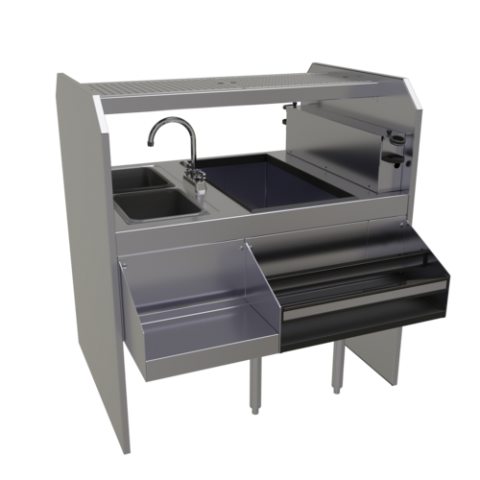 Assembly Style Pass-Thru Cocktail Station, 42"W x 32"D, leftward workflow, pass-thru ice bin, (2) wet waste sinks with (1) gooseneck faucet (low lead compliant) & strainers, liquor bottle storage, 15"D stainless steel draining shelf with removable perforated inserts, ETL-Sanitation (NOTE: Made to order, not returnable)