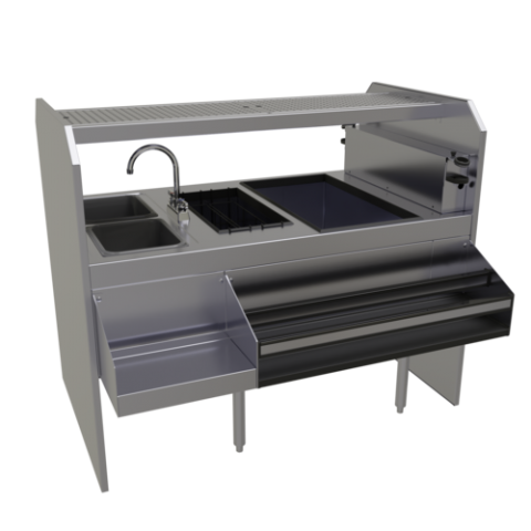 Assembly Style Pass-Thru Cocktail Station, 54"W x 32"D, leftward workflow, pass-thru ice bin, 8-bottle insulated storage well, (2) wet waste sinks with (1) gooseneck faucet (low lead compliant) & strainers, liquor bottle storage, 15"D stainless steel draining shelf with removable perforated inserts, ETL-Sanitation (NOTE: Made to order, not returnable)
