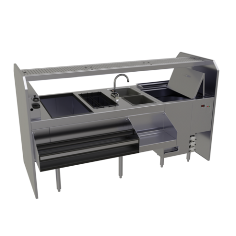 Complete Style Pass-Thru Cocktail Station with glasswasher, 78"W x 32"D, rightward workflow, GW24 automatic rotary glass washer with bifold cover, (2) wet waste sinks with (1) gooseneck faucet (low lead compliant) & strainers, pass-thru ice bin, 8-bottle insulated storage well, liquor bottle storage, dry waste receptacle, 12"D stainless steel draining shelf with removable perforated inserts, ETL-Sanitation (1 year parts & labor warranty on glasswasher, standard) (NOTE: Made to order, not returnable)