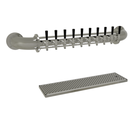 Pipe Wall Draft Dispensing Tower, wall mount, (10) stainless steel faucets (handles not included), glycol-cooled, insulated cold plate assembly, surface mount drain pan with removable perforated insert, all stainless steel construction, mirror finish (NOTE: Made to order, not returnable)"
