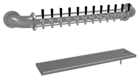 Pipe Wall Draft Dispensing Tower, wall mount, (12) stainless steel faucets (handles not included), glycol-cooled, insulated cold plate assembly, surface mount drain pan with removable perforated insert, all stainless steel construction, stainless steel finish (NOTE: Made to order, not returnable)"