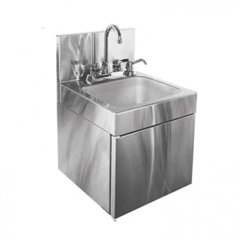 Hand Sink, wall mount with skirt, 14"W x 15"D OA, 9-1/4" wide x 11-1/2" front-to-back x 6" deep bowl, 4" OC deck mount faucet holes (faucet not included), built-in soap dispenser, C-fold towel dispenser on front, includes mounting bracket & 1-1/2" I.P.S. drain fitting, stainless steel construction, ETL-Sanitation