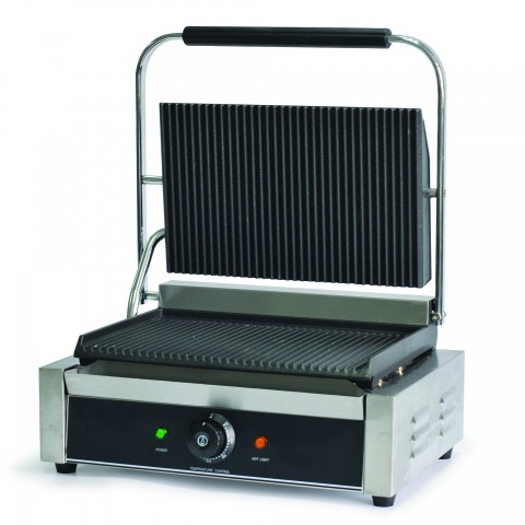 Panini/Sandwich Grill, 13" x 8-1/2" cooking surface, grooved seasoned cast iron heater plates, non-slip feet, stainless steel, 120v, 1750 watt, 14.6 amp, ETL