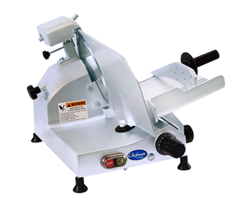 (QUICK SHIP) (MIDDLEBY ESSENTIALS ITEM) Chefmate™ Food Slicer, manual, 10" diameter knife, 0" to 9/16" slice thickness, removable gravity feed food chute, top mounted sharpener, slice deflector and knife cover, belt-driven, chute slide system, anodized aluminum, rubber feet, 1/4 HP, 115v/60/1, 2.5 amps, NEMA 5-15P, cETLus, ETL-Sanitation (Ships within 1-2 days)