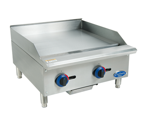 (QUICK SHIP) (MIDDLEBY ESSENTIALS ITEM) Chefmate™ 24" Gas Griddle, with manual controls, 3/4" polished griddle plate, lift off cooktop, 30,000 BTUs per burner, U-style burner provides heat control every 12" and flame every 6", adjustable pilots with front access, 3-1/4" back and side splash, cool-to-touch front edge, stainless steel construction, adjustable legs with stainless steel feet, 3-1/4" trough, Natural Gas with LP conversion kit included, CSA Sanitation (Ships within 1-2 days)