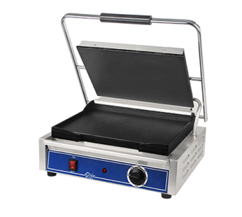 (QUICK SHIP) (MIDDLEBY ESSENTIALS ITEM) Sandwich Grill, 14"x10", seasoned cast iron smooth griddle plates, stainless steel construction, on/off switch, heavy-duty hinge, adjustable stainless steel non-skid feet, catch tray, 120v/60/1-ph, 1800 watts, 15.0 amps, NEMA 5-15P, 4 ft. power cord, NSF, cULus (Ships within 1-2 days)