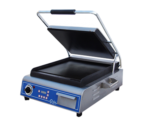 (QUICK SHIP) (MIDDLEBY ESSENTIALS ITEM) Sandwich/Panini Grill, single, countertop, electric, cast iron smooth plates, 14" x 14" cooking surface, electronic timer with (4) programmable presets, temperature control to 570°F, spring hinge with adjustable tension, stainless steel removable catch tray, rubber feet, stainless steel construction, 120v/60/1-ph, 1800 watts, NEMA 5-15P, 4 ft. power cord, NSF, cULus (Ships within 1-2 days)