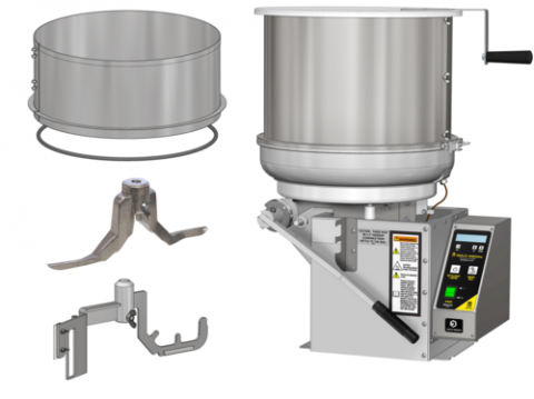 Combo King, combination unit for corn treat (5 gallon capacity), pralinator (approx. 4–4.5 lb. of finished product per batch), fudge (approx. 8 lb. per batch), right-hand dump, Membrane Keypad Control with 2-line digital display, cast aluminum kettle with stainless steel drum, 3408 watts, L14-20P Nema plug, 120/208v/60/1-ph, NSF, cULus