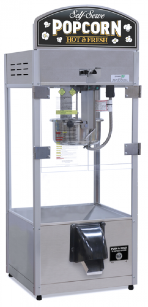 ReadyPop® Jr. Popcorn Popper & Self-Serve Dispenser, back counter, countertop model, 8 oz. stainless steel kettle, popcorn crisping system, pushbutton activated popcorn dispenser, 1200 watts, 120v/60/1, cord with NEMA 5-15P, cETLus, ETL