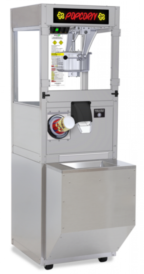 ReadyPop® Popcorn Popper & Self-Serve Dispenser with Base, back counter, 16 oz. stainless steel kettle, popcorn crisping system, pushbutton activated popcorn dispenser, LED lighted sign, integrated cup holder, stainless steel cabinet construction, casters, 1575 watts, 120v/60/1-ph, NEMA 5-15P, cETLus, UL EPH Classified