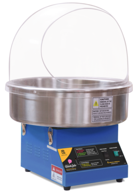 The QuickSpin®, single serve cotton candy machine, voltage drop resistant power output, 3 mode electronic temperature control (QuickStart, QuickCool, and Standby), stainless steel floss pan, clear bubble