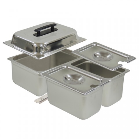 Steamer Pan & Lid Kit, includes: (1) 1/2 x 6 pan, (1) dome lid with handle, (2) 1/4 x 6 pans with flat slotted lids & (1) crossbar