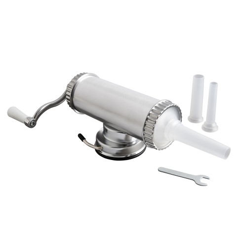 Fante's Uncle Attillo's Sausage Maker, 2.2lb capacity, 16-1/2" x 4" x 5", includes: (3) nozzles (15mm, 19mm & 22mm), instructions & recipes, disassembles for cleaning, suction base, aluminum and plastic, white