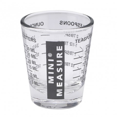 Kolder Mini Measure, 2" x 2" x 2-1/2", capacity: 1 oz., 2 tbsp, 6 tsp., glass, black