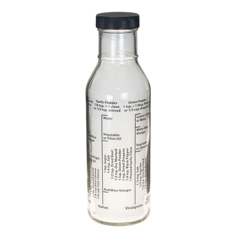 Kolder Salad Dressing Bottle, 12 oz., airtight lid, measure, mix, serve & stores, 8 recipes on printed with measurements on bottle, glass
