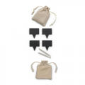Maison du Fromage's Slate Cheese Markers Set, set includes (4) slate markers (2.16 x 2.36 x 0.23-inches), (2) soapstone pens (3.2 x 0.25 x 0.25-inches), and (1) linen storage bag (4.5 x 3.75-inches), slate markers and storage bag are hand washable