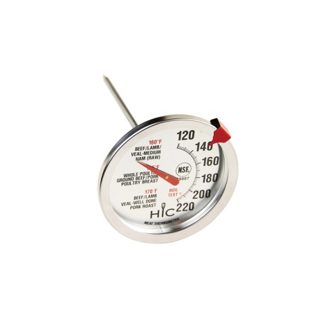Meat Thermometer, 2-1/2" dial display, analog, 120°F to 220°F temperature range, movable red indicator, oven & dishwasher safe, stainless steel, NSF