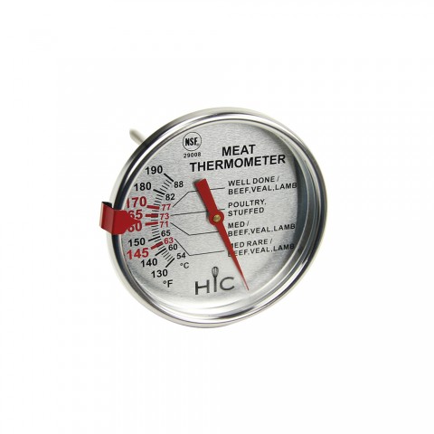 Meat Thermometer, 3" dial display, analog, 130°F to 190°F temperature range, movable red indicator, oven & dishwasher safe, stainless steel, NSF