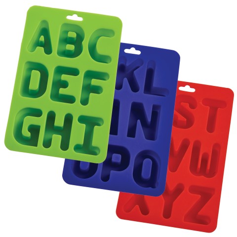 HIC Letters Ice Tray/Mold, 7" x 4-1/2", makes (26) letter shaped cubes, freezer/microwave/dishwasher safe, heat safe up to 500°F, silicone, assorted colors (green, blue, red) (3 each per set)