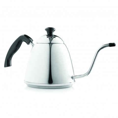 Fino Pour Over Tea Kettle, 48 oz. (1 liter), narrow gooseneck curve spout, stove-top safe, induction safe, dishwasher safe, angled thermo-plastic handle, 18/8 stainless steel
