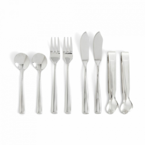 Maison du Fromage Charcuterie Serving Set, 8-piece, 18/8 stainless steel; set includes (2) each: forks (5.5"), spoons (4.5"), spreaders (6"), and tongs (4.5")