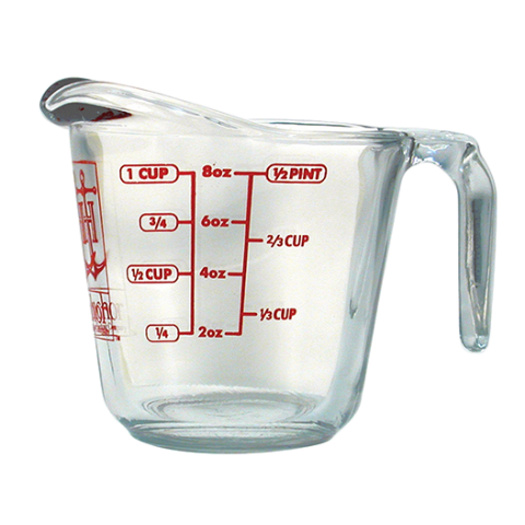 Anchor Hocking Measuring Cup, 8 oz., oven proof glass, fully tempered, red measurements (must be purchased in case quantities)
