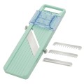 Benriner Mandoline Slicer, 12-1/2" x 3-3/4" x 1", (1) straight edge blade, (1) coarse blade, (1) medium tooth blade, (1) fine tooth blade, safety guard, non-skid rubber base, BPA free, dishwasher safe, stainless steel blades, plastic, green, Made in Japan