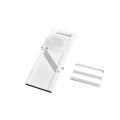 Benriner Super Mandoline Slicer, 14-1/2" x 5-1/4", (1) straight edge blade, (1) coarse blade, (1) medium tooth blade, (1) fine tooth blade, adjustable thickness, safety guard, non-skid rubber base, BPA free, dishwasher safe, stainless steel blades, plastic, white, Made in Japan