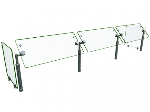 Flav-R-Shield® B950 Food Shield, adjustable self-service, 3 Bays 96"W x 18"D x 23"H, heat tempered glass construction throughout with 3/4" radius corners and polished edges, 3/8" thick glass front and side panels, 1" OD brushed 304 stainless steel posts, adjustable Face Panel rotation in 15-degree increments, NSF component, Made in the USA