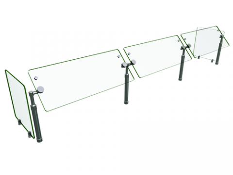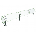 Flav-R-Shield® B950SWIVEL Food Shield, adjustable self-service, 3 Bays 108"W x 18"D x 23"H, heat tempered glass construction throughout with 3/4" radius corners and polished edges, 3/8" thick glass front and side panels, 1" OD brushed 304 stainless steel posts, adjustable Face Panel rotation in 15-degree increments, Bracket Heads on Face swivel 90 degrees up to 270 degrees to accomodate turns using multiple bays, NSF component, Made in the USA