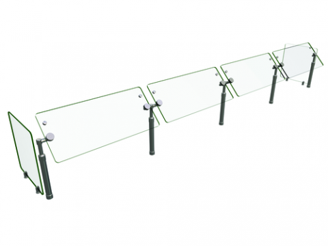 Flav-R-Shield® B950SWIVEL Food Shield, adjustable self-service, 4 Bays 132"W x 18"D x 23"H, heat tempered glass construction throughout with 3/4" radius corners and polished edges, 3/8" thick glass front and side panels, 1" OD brushed 304 stainless steel posts, adjustable Face Panel rotation in 15-degree increments, Bracket Heads on Face swivel 90 degrees up to 270 degrees to accomodate turns using multiple bays, NSF component, Made in the USA