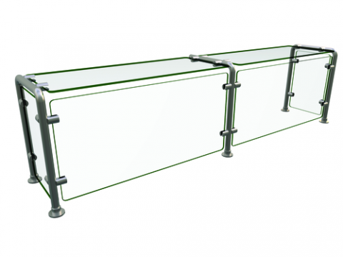 Flav-R-Shield® EP12 Food Shield, full service pass-over, 2 Bays 60"W x 12"D x 18"H, 1/4" thick heat tempered glass construction throughout with 3/4" radius corners and polished edges, glass top shelf, front and side panels with back post, 1" OD brushed 304 stainless steel posts, NSF component, Made in the USA