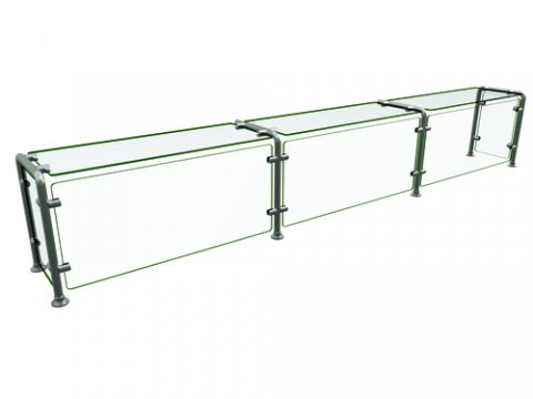 Flav-R-Shield® EP12 Food Shield, full service pass-over, 3 Bays 96"W x 12"D x 18"H, 1/4" thick heat tempered glass construction throughout with 3/4" radius corners and polished edges, glass top shelf, front and side panels with back post, 1" OD brushed 304 stainless steel posts, NSF component, Made in the USA