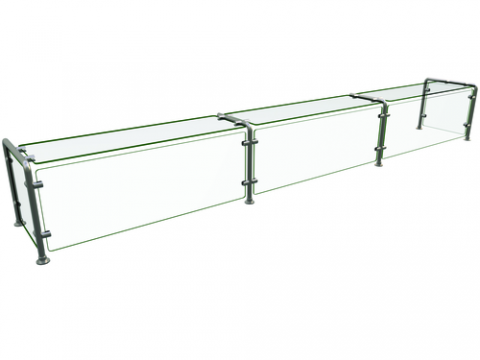 Flav-R-Shield® EP12 Food Shield, full service pass-over, 3 Bays 120"W x 18"D x 18"H, 1/4" thick heat tempered glass construction throughout with 3/4" radius corners and polished edges, glass top shelf, front and side panels with back posts, 1" OD brushed 304 stainless steel posts, NSF component, Made in the USA