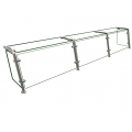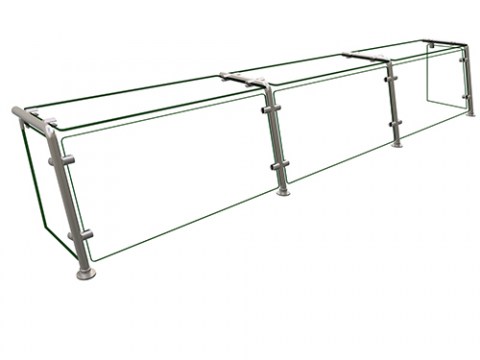 Flav-R-Shield® EP21 Food Shield, full service pass-over, 3 Bays 96"W x 12"D x 18"H, 1/4" thick heat tempered glass construction throughout with 3/4" radius corners and polished edges, glass top shelf, front and side panels, 1" OD brushed 304 stainless steel posts, front post tilted back to an 80 degree angle, NSF component, Made in the USA