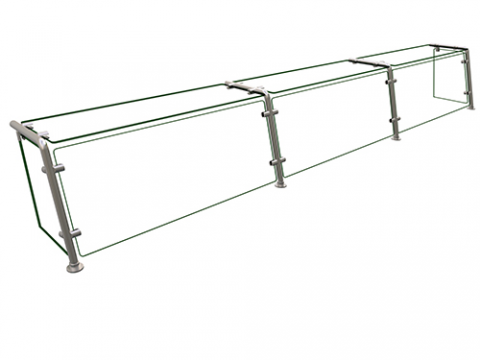 Flav-R-Shield® EP21 Food Shield, full service pass-over, 3 Bays 108"W x 12"D x 18"H, 1/4" thick heat tempered glass construction throughout with 3/4" radius corners and polished edges, glass top shelf, front and side panels, 1" OD brushed 304 stainless steel posts, front post tilted back to an 80 degree angle, NSF component, Made in the USA