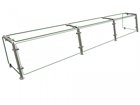 Flav-R-Shield® EP21 Food Shield, full service pass-over, 3 Bays 108"W x 15"D x 18"H, 1/4" thick heat tempered glass construction throughout with 3/4" radius corners and polished edges, glass top shelf, front and side panels, 1" OD brushed 304 stainless steel posts, front posts tilted back to an 80 degree angle, NSF component, Made in the USA