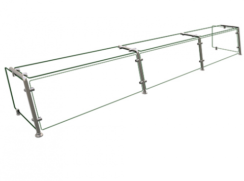 Flav-R-Shield® EP21 Food Shield, full service pass-over, 3 Bays 120"W x 18"D x 18"H, 1/4" thick heat tempered glass construction throughout with 3/4" radius corners and polished edges, glass top shelf, front and side panels, 1" OD brushed 304 stainless steel posts, front posts tilted back to an 80 degree angle, NSF component, Made in the USA
