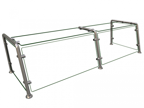 Flav-R-Shield® EP22 Food Shield, full service pass-over, 2 Bays 60"W x 18"D x 18"H, 1/4" thick heat tempered glass construction throughout with 3/4" radius corners and polished edges, glass top shelf, front and side panels with back posts, 1" OD brushed 304 stainless steel posts, front posts tilted back to an 80 degree angle, NSF component, Made in the USA