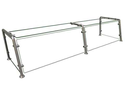 Flav-R-Shield® EP22 Food Shield, full service pass-over, 2 Bays 72"W x 18"D x 18"H, 1/4" thick heat tempered glass construction throughout with 3/4" radius corners and polished edges, glass top shelf, front and side panels with back posts, 1" OD brushed 304 stainless steel posts, front posts tilted back to an 80 degree angle, NSF component, Made in the USA