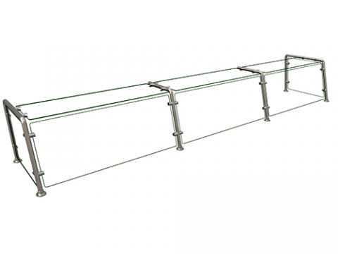 Flav-R-Shield® EP22 Food Shield, full service pass-over, 3 Bays 108"W x 18"D x 18"H, 1/4" thick heat tempered glass construction throughout with 3/4" radius corners and polished edges, glass top shelf, front and side panels with back posts, 1" OD brushed 304 stainless steel posts, front posts tilted back to an 80 degree angle, NSF component, Made in the USA